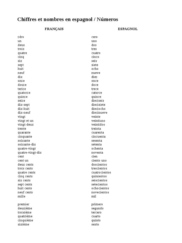 Créé par miss54000 le 20 jan. Voici des chiffres et nombres en espagnol : Chiffres et nombres de 1 à 100. Les chiffres doivent être écrits avec des traits d'union au lieu d'espaces, afin de réduire l'ambiguïté (en. De 1 à 100 en espagnol;